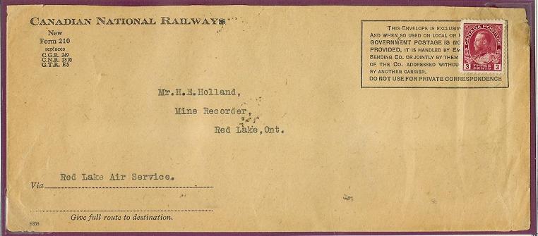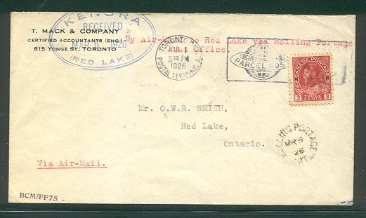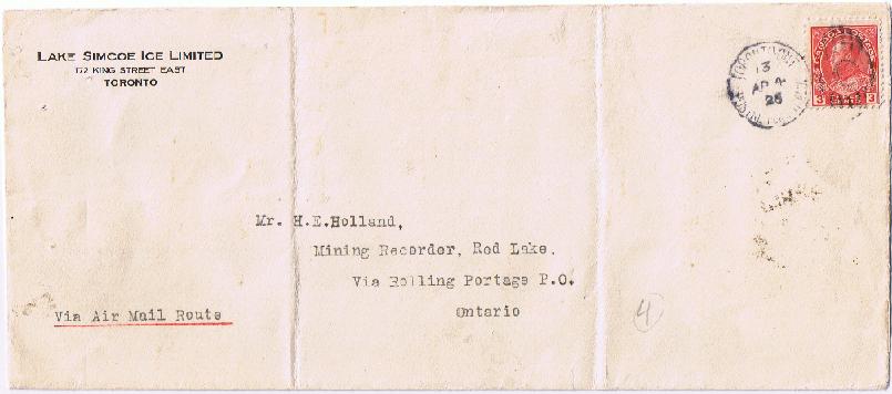 A very interesting commercial cover sent to the Mining Recorder's office. This cover arrived from Toronto to Rolling Portage on April 14, 1926.