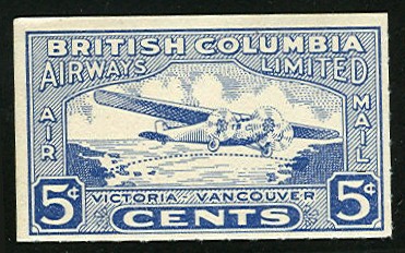 Formed in 1927, the company planned to open an air servicve between Vancouver, Victoria and Seattle. Purchasing a Ford 4-AT-B Tri-motor passenger airplane, the company made its first passenger carrying flight on July 23, 1928. Soon after, the company had permission from postal authorities in Ottawa to issue a company semi-official stamp.