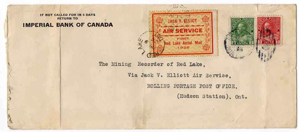 A cover sent from Winnipeg on March 29, 1926 and arrived at Red Lake on April 3, 1926. The cover was sent to Jack Elliot, postmaster of Red Lake.