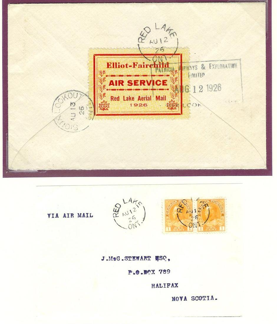 August 12, 1926.Red Lake to Sioux Lookout to Halifax.CL8 issued by Elliot-Fairchild with cache added by Patricia Airways and Exploration Ltd.Back of Cover