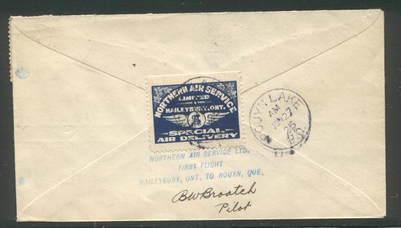 With Laurentide Air Service ceasing operations in January 1925, a new air service began flying into the Rouyn goldfields. Northern Air Service, formed by former Laurentide pilot B.W. Broatch, established a base in Haileybury and began flying into Rouyn in May 1925. With the success of this flight, postal authorities in Ottawa granted the company the authority to issue a stamp and charge for air mail service.